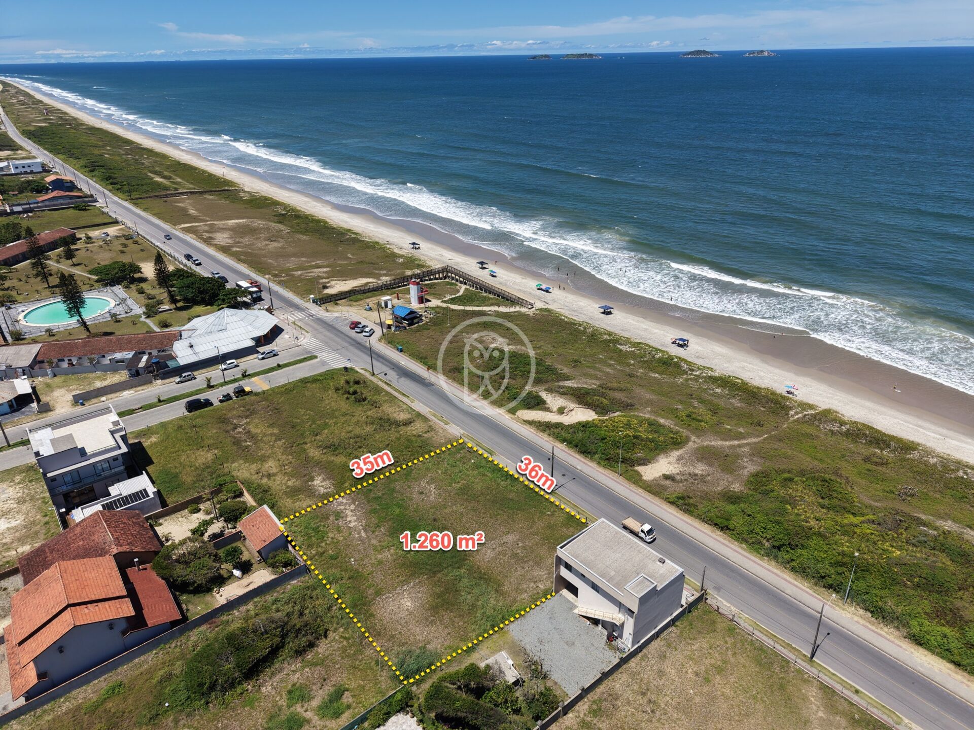 Com 36 metros de frente para o mar e situado numa zona central, este lote destaca-se pela infraestrutura completa: asfalto e calçadas ao longo de toda a orla, conforto conforto